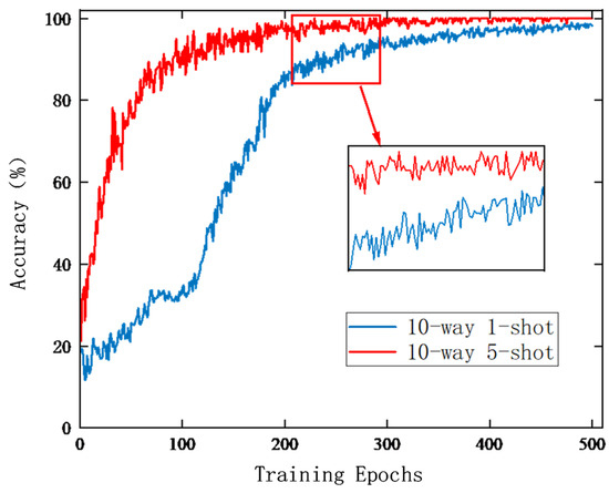 To evaluate the performance of the SL-GPN model under few-shot conditions, we plotted the training accuracy curves, as shown in Figure 6. The blue curve represents the change in accuracy over training iterations under the 10-way one-shot setting, while the red curve corresponds to the 10-way five-shot setting. In both experiments, the model achieves satisfactory performance after approximately 400 training iterations. Specifically, the blue curve shows a gradual increase from a low accuracy level, eventually stabilizing with some fluctuations in the later stages. The red curve exhibits generally higher accuracy, faster convergence, and greater stability during the later training phase. At around 200 training iterations, a notable difference between the two settings is observed: the red curve, benefiting from more abundant samples, attains significantly higher accuracy with reduced fluctuations compared to the blue curve, demonstrating the impact of the sample size on the training dynamics of the few-shot learning models.