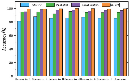 Scenario 1 uses bearing data under 0 HP load for source-domain training and bearing data under 1 HP load for target-domain testing. Scenario 2 employs 0 HP load data as the source domain and 2 HP load data as the target domain. Scenario 3 uses 1 HP load data for the source domain and 0 HP load data for the target domain. Scenario 4 uses 1 HP load data as the source domain and 2 HP load data as the target domain. Scenario 5 takes 2 HP load data as the source domain and 0 HP load data as the target domain. Scenario 6 uses 2 HP load data for the source domain and 1 HP load data for the target domain. From the source-domain data, batches of 10-way five-shot meta-learning tasks were constructed to train the classification model, which was then evaluated on the target-domain data for cross-domain testing. The experimental results are presented in Figure 7.