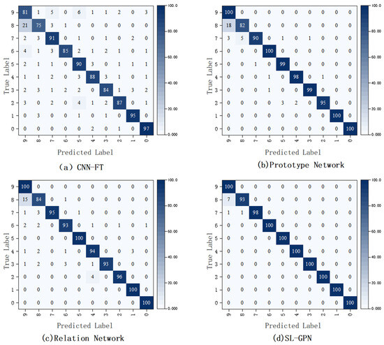 In Figure 8a, the diagonal values of CNN-FT are low, with only 81 instances where the true label 0 is correctly predicted as 0. In contrast, there are many off-diagonal values, with 21 instances where the true label 1 is incorrectly predicted as 0. This indicates that the model has more classification errors and weaker performance. In Figure 8b, the diagonal values of the Prototype Network are relatively high, mostly between 90 and 100, but there are still some misclassifications, such as five instances where the true label 1 is incorrectly predicted as 2. This suggests that the model’s performance is slightly better than that of CNN-FT. In Figure 8c, the diagonal values of the Relation Network have further improved, reaching up to 100 in some cases, with fewer misclassifications, for example, only 15 instances where the true label 7 is incorrectly predicted as 8, indicating more accurate classification. In Figure 8d, the diagonal values of the SL-GPN are mostly 100, with only one instance where the true label 8 is incorrectly predicted as 7. This indicates that the model has a lower misclassification rate and the best classification performance.