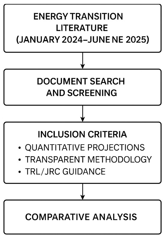 This study employed a structured selection process to identify high-quality, policy-relevant scenarios and publications from the most recent energy-transition literature. The inclusion criteria focused on documents published between January 2024 and June 2025, offering quantitative projections of electricity demand, investment needs, capital costs, and supply chain risks. Only those sources that provided transparent methodological descriptions—such as baseline definitions, economic and technological assumptions, and scenario design—were considered. Particular attention was given to scenarios conforming to the TRL (Technology Readiness Level) thresholds and the methodological guidance of the Joint Research Centre (JRC) for forward-looking energy analyses. In total, thirty-eight documents were initially screened, from which twelve met all quality and transparency criteria and were retained for comparative analysis.