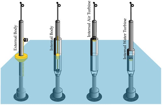 Early WEC design concepts considered. Modifications to the X-Spar center section expose the inside to ocean water and the atmosphere. From left to right: External Body—unchanged X-Spar with torus-shaped float connected to generator; Internal Body—modified X-Spar with internal floating body connected to generator (above water or submerged); Internal Air Turbine—modified X-Spar with air turbine and generator above water; Internal Water Turbine—modified X-Spar with submerged water turbine and generator.