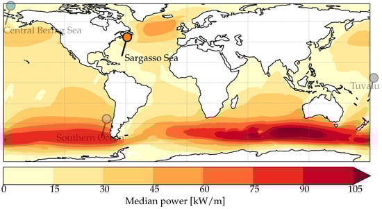 Map of design sites with median wave power. This study focuses on the Sargasso Sea, which has the smallest wave resource, providing a conservative estimate for power conversion capabilities. Future study sites include Tuvalu, Central Bering Sea, and the Southern Ocean, which may require different hardware and controller gains.