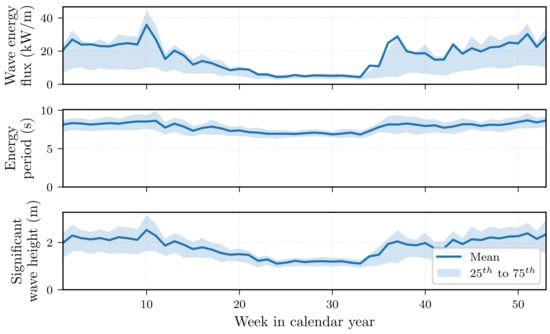 This study presents results specifically optimized for the Sargasso Sea as it is the location with the lowest wave resource, making it the most challenging site for converting the desired amount of electrical power. The underlying averaged weekly sea states derived from 14 years (2009–2023) of spectral wave density data collected from the National Data Buoy Center (NDBC) buoy #41049 are illustrated in Figure 4, along with a confidence interval that indicates the range within which a respective quantity is expected to fall with 50% likelihood.