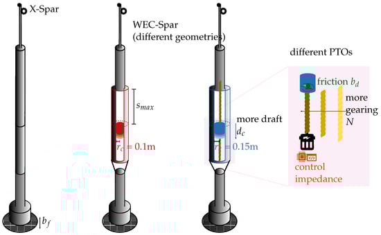 Schematic representation of the systems: the original system, X-Spar, is shown on the left, while the augmented system, “WEC-Spar”, incorporating a power take-off module for capturing ocean wave energy, is depicted on the right. Design optimization variables include the cylinder radius , the cylinder draft , the drive-train friction , the linear to rotary gear ratio N, and the control impedance. The maximal stroke is a hardware constraint.