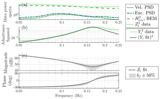 Averaged power spectral density (PSD) of the onboard X-Spar data (a) to identify the X-Spar squared intrinsic admittance () (b) and the corresponding intrinsic impedance () with sensitivity to the heave damping coefficient () (c).