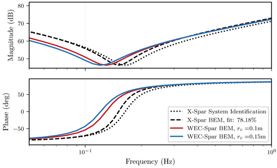 For the system identification, we use data from an onboard inertial measurement unit (IMU) for velocity and position information as well as pressure readings from a sensor mounted partially down the spar tube for the relative water depth from a two-day test deployment of the X-Spar in November 2019 south of Cape Cod. The recorded waves’ peak period ranged from approximately 6 s to 10 s. The X-Spar’s data acquisition system was never intended to provide information for a system identification campaign. Consequently, likely due to issues with the phase shift between distinct sensors, the methods presented by Bacelli et al. [] could not identify inertia values that we could validate against the known X-Spar’s rigid body mass. Instead, we chose an approach based on identifying the X-Spar dynamics based on purely real power spectral densities (PSDs), i.e., the results become insensitive to the phase. The major underlying assumptions are, first, that the excitation PSD () is equal to the wave height signals PSD, since the X-Spar behaves like a low pass filter. This method is limited to floating structures that are mostly driven by hydrostatics. The second assumption is that the BEM code capytaine can predict the excitation transfer function coefficient () sufficiently well. Together with the PSD of the velocity measurements averaged over the entire deployment length, the following expression can be used for the square of the intrinsic admittance ():