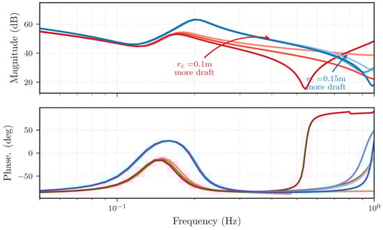 Equivalent hydrodynamic impedance Bode diagram observed at the PTO of the WEC-Spar system for different geometry dimensions.