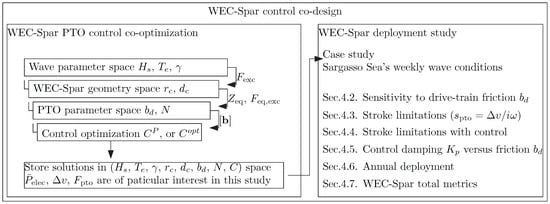 The functional requirements are detailed in the Section 2 (“Collaborative Design”). Section 3.1 (“Dynamic Model”) presents linear wave-to-wire models. We introduced a numerically optimal controller and a proportional controller optimized for maximizing average electrical power in Section 3.3 (“Control”). In Section 4 (“Results”), we describe the different power take-off (PTO) configurations based on realistic hardware to create a well-matched WEC-PTO system. Within Section 5 (“Conclusions”), we conclude that the average electrical power levels predicted from the numeric models would improve the X-Spars mission as intended, but drive-train friction uncertainty and nonlinear control approach should be investigated in the future.