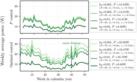 Figure 11 demonstrates that the configurations from the previous solution space also appear in this analysis and we learn that, for example, the lowest considered drive-train friction value would not satisfy the stroke constraint (albeit only marginally at week 10, as seen for the darkest (blue) line). Of course, if a low-friction scenario can be achieved in practice, we would not dismiss this drive-train configuration. Instead, we would explore other variables to influence the maximum stroke.