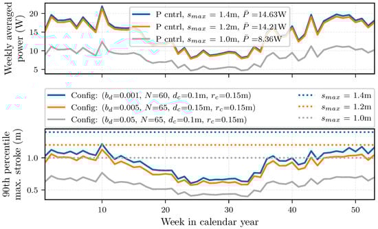 Weekly averaged power and 90th percentile of the maximal observed stroke for three sub-optimal configurations to stay within three distinct values of PTO stroke . The levels of PTO stroke limit are illustrated with the dashed lines.