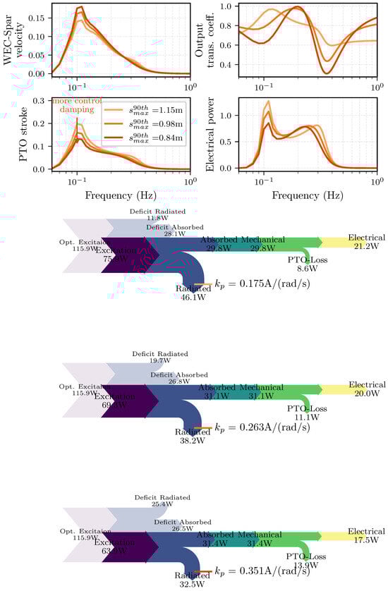 A notable observation can be drawn from the output power transmission coefficient (upper right axes) in combination with the Sankey diagrams: as control damping increases (starting from the optimal), less power is transmitted to the load (or equivalently, more power is reflected from the load). Specifically, although higher damping leads to a reduction in the conversion of wave excitation, it simultaneously allows for an increase in the absorbed power entering the system. However, this power does not reach the load, as it is reflected back and ultimately dissipated within the PTO. Consequently, the hardware must exert additional effort to stay within the stroke limitations. Our analysis indicates that increasing the damping reduced the maximum stroke during this sea state by approximately 27%, while also resulting in a 17% decrease in average power. It is worth noting that nonlinear control may present a viable alternative, potentially mitigating the trade-off associated with average power reduction.