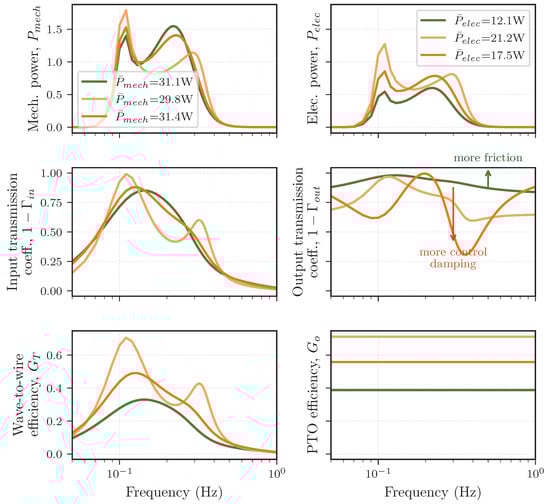 There are a few notable conclusions from Figure 13. First, as noted in Section 3.1.2 (“PTO Model”), the absorbed mechanical power is misleading if it were used as an objective. Both increasing the friction or increasing the damping (from its optimized value), caused an increase in mechanical power absorption, but results in a deficit in converted electrical power. We cannot draw any quantitative conclusions from the magnitude of any quantity presented in Figure 13 because of the arbitrary perturbations. However, for the WEC-Spar, increased PTO friction and control damping cause similar trends across most measures, as both contribute to greater resistance against the relative velocity. The notable difference lies in the opposite trend observed in the output power transmission coefficient. For an increased drive-train friction (represented by the green line), the optimized damping control for the specific configuration is better able to match the WEC-Spar’s output impedance. The increased friction broadens the total system response, allowing the damping control to effectively match it over a wider range. However, a better-matched output in isolation could be misleading regarding the objective of maximizing electrical power, as evidenced by the significant decrease in efficiency and, consequently, average electrical power. The “wrong” controller primarily causes the difference in converted electrical power by mismatching the load to the overall system dynamics, preventing the absorbed power from effectively entering the load.
