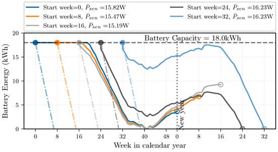 Annual battery energy trajectories with maximum average sensor draw to sustain operation for an entire year for different deployment starts. The dash-dotted lines illustrate the rate at which the battery would be depleted assuming the increased sensor draw, but no additional generation.