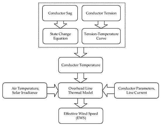 The concept of EWS is generally applied in the DLR techniques that rely on the monitoring of OHL status such as conductor temperature, sag or tension. The EWS is assumed to be perpendicular to the OHL and result in the same convective cooling effect as actual wind conditions. It can not only more accurately describe the convective cooling effect on overhead conductors, but is also of particular interest to the OHL sections that cross multiple terrains and experience various wind conditions, in which case the EWS could represent the average convective cooling effect of varying wind conditions on the entire OHL. By employing the thermal model of overhead conductors such as IEEE 738 Standard [4], the EWS can be derived from observations of line current, air temperature and solar radiation in combination with conductor temperature directly measured or indirectly inferred from sag or tension measurements, as shown in Figure 1. In general, the EWS which affects convective heat losses is calculated to reflect the monitored conductor temperature under steady state or the continuous variation of monitored conductor temperature under transient state, as formulated by (1) or (2), respectively.