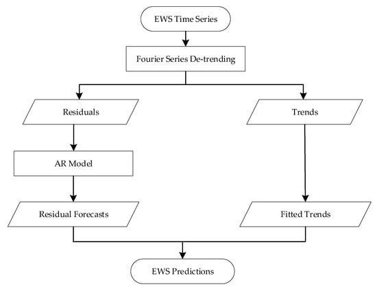 The AR-based time series forecasting model is developed here to calculate point forecasts of the residuals of EWS by capturing the auto-correlation from historical time series. A -order AR process with a time lag of is a stochastic model estimating the residual forecast for step(s) ahead as a linear combination of historical values and a Gaussian noise term denoted by [22]. This can be formulated by Equation (12).