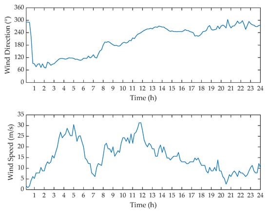 As was noted in Section 2.1, the EWS influences the convective heat loss rate only in the thermal model of overhead conductors. To assess the predictability of EWS and compare the EWS-based forecasting method with those that are inferred from actual wind conditions, the time series of EWS is estimated from measurements of wind speeds and directions in this work by assuming that the EWS provides the same cooling effect as wind speeds and directions. Convective heat loss is generally divided into two types, i.e., natural convection and forced convection. According to IEEE Standard 738 [4], natural convection occurs under stagnant air conditions and can be formulated by Equation (3). Forced convection is represented by either Equation (4) or (5). Equation (4) is used to calculate convective heat loss rate under low wind speeds, i.e., in the case of low Reynolds numbers . Equation (5) applies to the calculation of convective heat loss rate under high wind speeds, i.e., in the case of high .
