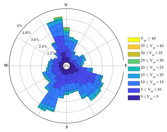 Figure 4 shows measurements of wind speeds and directions during a particular day. The overall distributions of wind speeds and directions measured over the two years are shown in Figure 5. For the weather station selected in this work, the wind directions along NNW, SE and SSW are more frequent throughout the two years. Furthermore, the wind directions along NNW and SSW are relatively more concentrated and their accompanying wind speeds are higher in part due to the local terrain. In the main, the actual wind speed measurements are distributed within 0–15 m/s. In order to examine the effects of line orientation or wind attach angle on EWS characteristics and predictability, four different line orientations of 0° (along Eastward), 30° (along ENE), 60° (along NNE) and 90° (along Southward) are adopted in this work. By using the specific EWS estimation method described in Section 2.2, the EWS that results in the same cooling effect on overhead conductors of 0° orientation as actual wind conditions is calculated. Due to the fact that the EWS assumes an attack angle of 90° which maximises the convective heat loss rate brought by a given wind speed, the EWS is shown to be smaller than or equal to the actual wind speed for all the time, as shown in Figure 6.