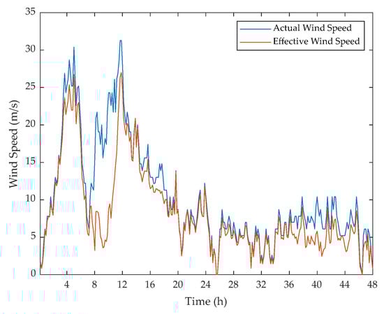 Comparison of actual and effective wind speed in the case of the 0° line orientation.