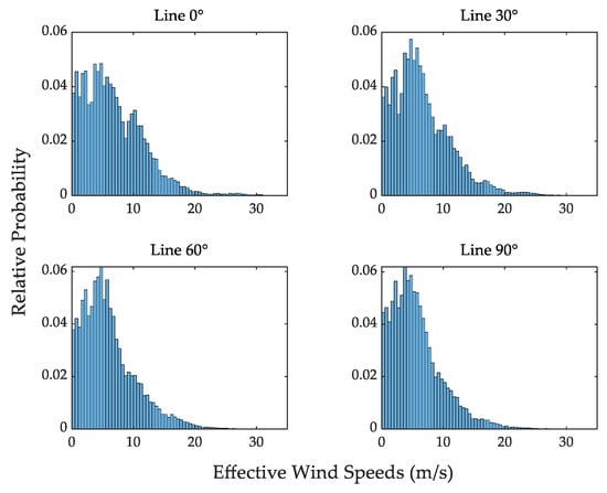 Figure 7 shows the distributions of the EWS estimates over the two years in the cases of different line orientations. As was noted above, since the EWS is always smaller than or equal to actual wind speed, the overall distribution of the EWS is found to skew more to the left compared to actual wind speed. In addition, when the line orientation is assumed to be 60° or 90°, there exists a wind direction cluster where wind directions are almost parallel to the line orientation (see Figure 5), which mitigates convective cooling effects and thus results in lower EWS. To that end, the amplitudes of EWS in the case of 0° or 30° line orientation are estimated to be greater on average than in the case of 60° or 90° line orientation. To quantitatively validate the difference in EWS between the four line orientations on average, the EWS distribution for each line orientation is modelled by the Gamma distribution which was found to provide better fitting than the Weibull distribution. The estimated shape () and scale () parameters as well as corresponding mean values () are listed in Table 1. Notably, the shape parameters of EWS distributions are estimated to be less than or equal to 2.03, which are smaller than the shape parameter of 2.65 estimated for the Gamma distribution of original wind speeds. This indicates the left-skewed nature of the EWS distribution as discussed above. In addition, the mean values of EWS decrease progressively from the 0° or 30° orientation to the 60° or 90° orientation, quantitatively confirming that EWS amplitudes are greater on average when more wind directions are almost perpendicular to the line orientation, and vice versa.