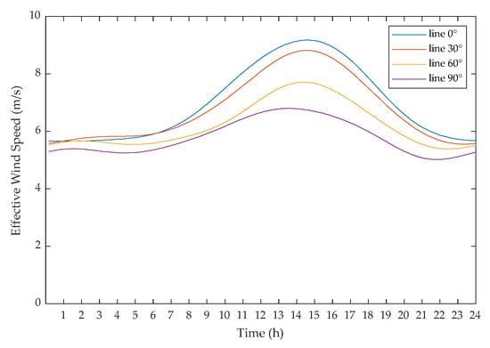 Given the determined from wind speed and direction measurements, the corresponding EWS perpendicular to overhead conductors (i.e., resulting in ) is calculated to replicate the same . It is noted that the EWS is set to 0 m/s when the is dominated by the natural convection which does not rely on wind conditions. The calculation of EWS is formulated by Equation (10) which are derived from Equations (3)–(5).