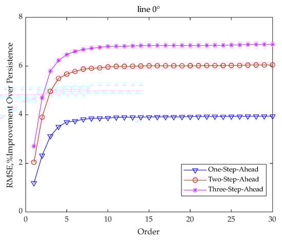 Improvement of AR models with different orders in RMSE over persistence for up to three steps ahead in the case of 0° line orientation.