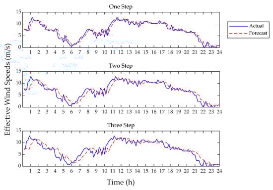 Ultra-short-term EWS predictions for up to three steps against actual EWS estimates in the case of 0° line orientation.