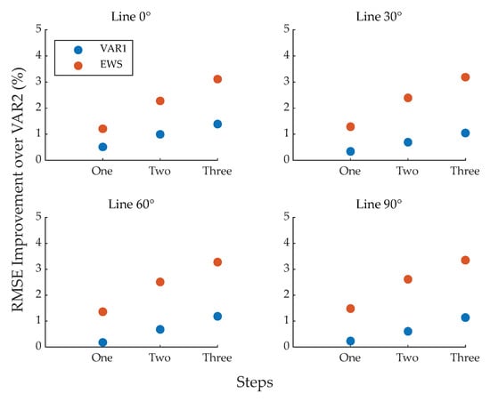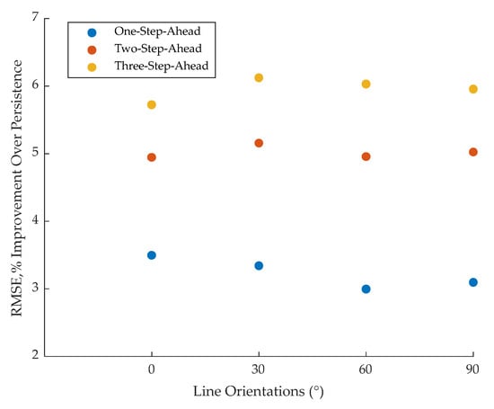 Improvement of AR models over persistence in RMSE of EWS predictions for up to three steps ahead under different line orientations.