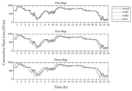 Convective heat loss rates predicted by EWS-, VAR1- and VAR2-based methods for up to three steps ahead against the actual estimates in the case of 0° line orientation.