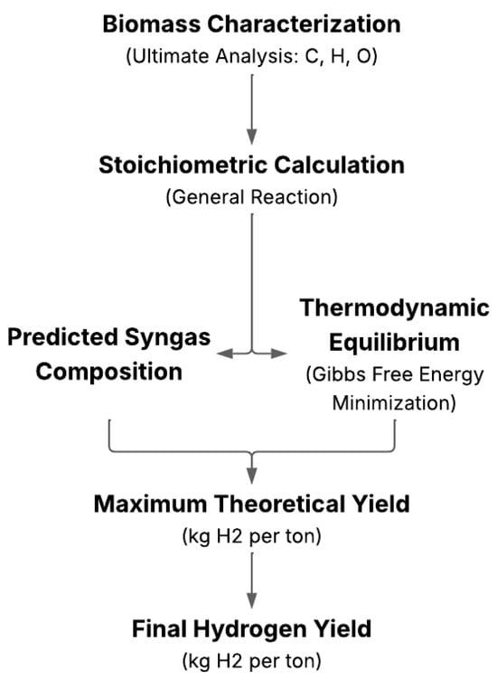 The integration of stoichiometric and thermodynamic equilibrium calculations in determining the final hydrogen yield values are presented in Figure 1, where the methodological workflow is depicted, beginning with biomass characterization data from ultimate analysis, which provides elemental composition (C, H, and O, etc.). This data feeds into stoichiometric calculations using the general reaction equation to compute the maximum theoretical hydrogen yield under ideal complete conversion assumptions. Concurrently, thermodynamic equilibrium modeling via Gibbs free energy minimization predicts the syngas composition, considering key reactions such as water–gas shift, methanation, and Boudouard. The predicted syngas hydrogen content is then adjusted through simulated water–gas shift and purification steps to derive practical yield estimates. These parallel approaches are integrated to provide bounded yield values, with stoichiometric results serving as upper limits and equilibrium modeling offering realistic process-informed projections. This combined methodology ensures comprehensive assessment while accounting for both ideal and equilibrium-constrained scenarios, aligning with the hydrogen yields reported in Section 4.4.