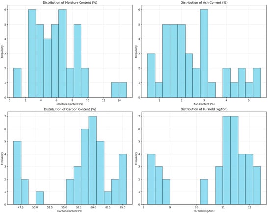 Figure 2 shows the distribution of key parameters affecting gasification performance, illustrating the variability in moisture content, ash content, carbon content, and theoretical hydrogen yields across the analyzed species. The distributions reveal that most Portuguese biomasses fall within favorable ranges for gasification applications.