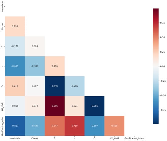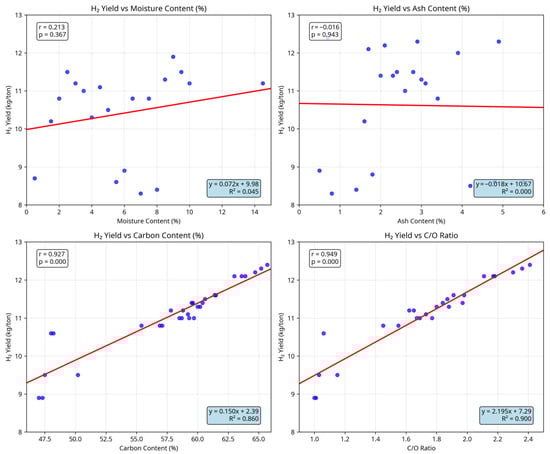 Figure 3 presents a correlation heatmap showing the relationships between key gasification parameters. The strong positive correlation between carbon content and hydrogen yield potential (r = 0.996) is clearly visible, along with negative correlations between moisture content and gasification performance.