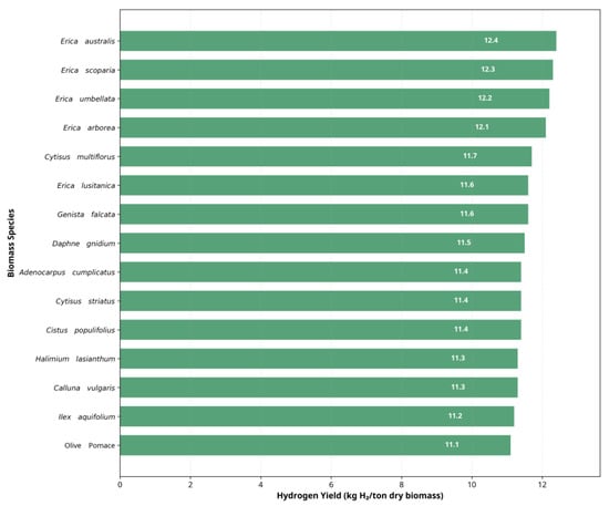 Although forest species like Eucalyptus globulus and Pinus pinaster often exhibit higher carbon content (typically 48–53%), contributing positively to gasification efficiency (r = 0.996 correlation with yield), woody shrubland species such as Erica australis and Cytisus multiflorus demonstrate superior theoretical hydrogen yields (average 11.4 ± 0.6 kg/ton vs. overall 10.7 ± 1.3 kg/ton). This discrepancy arises from differences in overall elemental composition affecting the stoichiometric yield calculation: H2 = (4C + H − 2O)/2. Shrubs generally possess higher hydrogen content (H ~5.8–6.0%) and lower oxygen (O ~42–43%), which enhances the net yield by reducing the oxygen penalty term (-2O) and boosting the hydrogen contribution, despite marginally lower carbon in some cases. For instance, Erica australis’ balanced C/H/O ratio yields ~12.4 kg/ton, compared to Pinus pinaster’s ~10.5–11.5 kg/ton with higher O (~45%). These compositional advantages, combined with lower ash (1–2% vs. 1–3% in forests) that minimizes slagging, make shrubs particularly suitable for efficient hydrogen production via gasification.