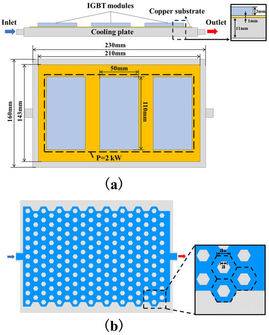 The geometric model consists of the IGBT, copper baseplate, and liquid cooling plate, as shown in Figure 1a. In this work, the IGBT modules transfer heat to the copper baseplate, which subsequently conducts it to the liquid cooling plate, where the coolant removes the heat via convection. Three IGBT modules are arranged in parallel, each with identical heat generation. The thicknesses of IGBT, copper substrate and cooling plate are 3 mm, 1 mm and 11 mm, respectively. Figure 1b shows the dimensional parameters of the honeycomb-structured microchannels. Due to the structural complexity of the honeycomb-structured microchannel cooling plate, castability is an important factor in the die-casting process. Therefore, aluminum alloy ADC12 is selected as the material for the cooling plate. The thermophysical properties of the coolant, cooling plate, and other relevant materials are listed in Table 1 [31]. In Figure 1b, a denotes the channel width, and am denotes the honeycomb-structured cell size, which correspond to the parameters listed in Table 2.