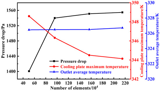 To assess the influence of mesh resolution on the numerical results, four mesh schemes with varying element counts (ranging from 0.5 million to 2 million) were tested. For each case, three key output parameters were monitored: the maximum temperature on the cooling plate, the average coolant outlet temperature, and the pressure drop between inlet and outlet. As shown in Figure 3, when the total number of elements exceeded approximately 1,566,849, variations in these parameters became negligible, indicating grid independence. Therefore, the mesh with 1,566,849 elements was selected for all subsequent simulations, offering a good balance between computational cost and solution accuracy.