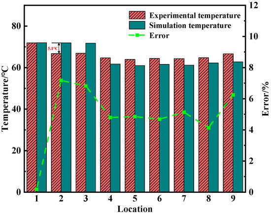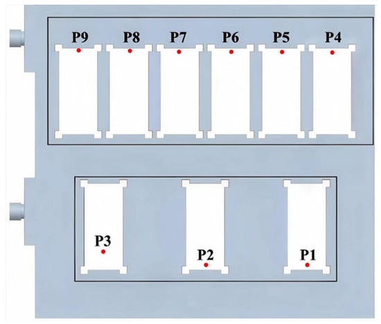 To validate the accuracy of the numerical model developed in this study, comparative analysis was conducted using experimental data published by Gao et al. [31]. Under identical geometric configurations and thermal boundary conditions, the liquid cooling plate model from the reference was reconstructed, and independent simulations were carried out using a self-developed numerical framework. Key conditions include a total heating power of 4 kW with non-uniform heat source distribution, an inlet coolant temperature of 318.15 K, and a mass flow rate of 0.2 kg/s—all consistent with the experimental setup. The geometric model in this section was constructed based on the experimental model reported in Reference [31]. To enable comparison with the experimental results, nine measurement points from the experimental model were selected as the analysis points for the numerical simulation. Figure 4 shows the schematic of the model and the locations of these six points, ensuring the comparability of the numerical simulation results with the experimental data.