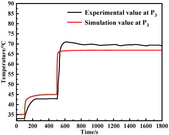 Comparison of transient temperature profiles at measurement point 3 between the simulation and experiment.