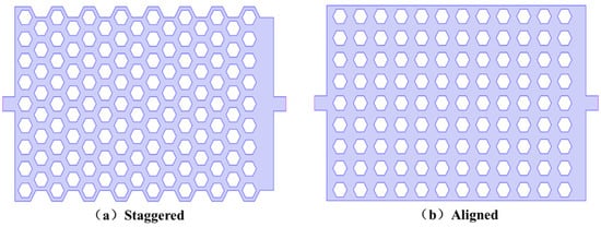 To enhance the overall thermal management performance of microchannel cooling plates for high-power electronic devices, this study investigates the influence of honeycomb-structured unit arrangements—based on a bionic honeycomb-structured—on thermo-fluid characteristics. Two typical structural configurations were designed: a conventional staggered honeycomb-structured layout and an aligned arrangement. The specific geometries are illustrated in Figure 7. The inlet coolant flow rate was set to 2.5 L/min with a temperature of 313.15 K, and each IGBT module was assigned a heat dissipation power of 666.76 W.