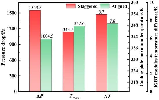 Figure 8 presents a comparison of the pressure drop, maximum interface temperature between the IGBT and the cooling plate, and the temperature difference under the two arrangements. Temperature difference refers to the maximum temperature variation among the three IGBT modules. It is evident that the staggered configuration achieves a 3.1 K lower peak temperature compared to the aligned layout, albeit at the expense of a 545.3 Pa increase in pressure drop. The temperature difference between modules is relatively small, with only a 1.1 K difference. Overall, considering both heat dissipation effectiveness and temperature uniformity, the staggered structure demonstrates superior performance.