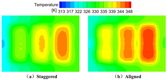 Figure 9 illustrates the surface temperature contour plots of the cooling plate under the two structural layouts. The staggered configuration exhibits a generally lower surface temperature. Although the overall temperature difference is slightly larger, the temperature distribution is more uniform compared to that of the aligned configuration.