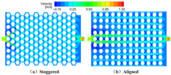 Figure 10 displays the velocity contour plots for both configurations. In the aligned layout, the coolant primarily flows along the main inlet-to-outlet path, resulting in the highest velocity near the inlet and significantly reduced flow in the lateral regions. In contrast, the staggered design facilitates lateral fluid diffusion, leading to a more uniform velocity distribution. The uneven flow in the aligned layout tends to produce localized hotspots.