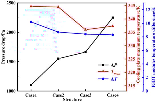 Figure 12 illustrates the thermal performance comparison among the four cases. Narrowing the channel width significantly improves cooling performance. For instance, the maximum temperature in Case 3 is reduced by 8.7 K compared to Case 1 (from 344.7 K to 336 K). In terms of temperature uniformity, Case 4 performs best, reducing the IGBT temperature difference from 10.2 K (Case 1) to 8.3 K, indicating more uniform heat dissipation. However, Case 4 also shows a markedly increased pressure drop—over twice that of Case 1—highlighting the trade-off between enhanced heat transfer and increased flow resistance.