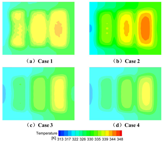 Figure 13 presents the temperature contours of the cooling plate surface. While Case 1 shows relatively better heat dissipation near the outlet compared to Case 2, it offers limited improvement for IGBT modules near the inlet. In contrast, both Case 3 and Case 4 exhibit lower overall temperatures and improved thermal uniformity, suggesting that the combination of large honeycomb-structured cells and narrow channels is effective in enhancing cooling performance.