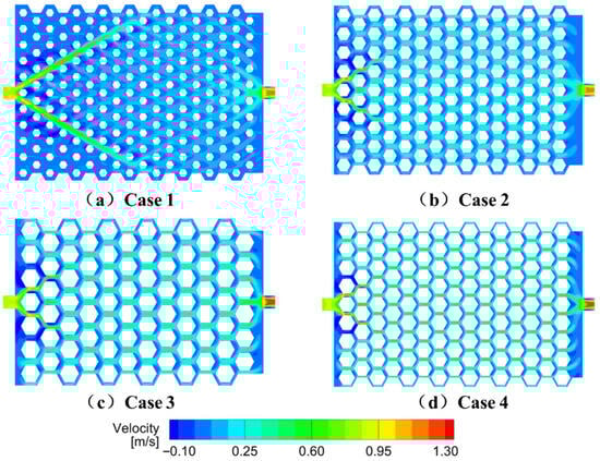 To investigate the influence of honeycomb-structured cell size and channel width on the cooling performance of the liquid-cooled plate, four structural configurations (Case 1 to Case 4) with symmetric layouts were designed. The detailed geometric parameters are listed in Table 2. Case 2 serves as the baseline, featuring honeycomb-structured units and flow channels of equal width. Case 1 employs wider channels and smaller honeycomb-structured cells, which increases the number of vortex-inducing posts and enhances heat exchange surface area. Case 3 adopts larger honeycomb-structured cells, while Case 4 narrows the channel width with the intent of accelerating coolant flow and improving flow uniformity. All other boundary conditions remain unchanged.