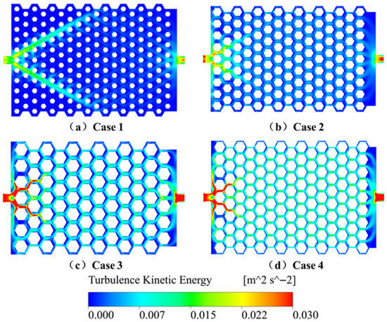 Figure 15 illustrates the TKE distribution across the different cases. In Case 1, TKE is predominantly concentrated near the inlet, with weak turbulence downstream, resulting in poor coolant mixing and local heat accumulation. Case 2 offers more balanced TKE distribution but with limited intensity, which restricts thermal diffusion. In comparison, Cases 3 and 4 exhibit significantly stronger and more widespread turbulence, particularly in Case 4, where intense mixing occurs near the inlet and in transverse channels. This leads to more efficient fluid mixing and heat transport, producing a more uniform temperature field. These results confirm that combining large honeycomb-structured units with narrow flow channels enhances turbulence intensity and heat transfer uniformity, although the associated increase in pressure drop must be carefully considered in practical designs.