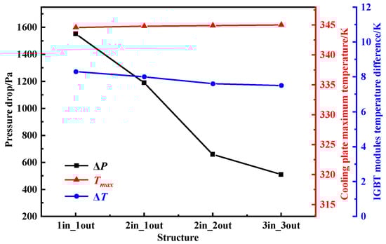 Figure 16 presents the variations in key thermal and hydraulic performance metrics—including pressure drop, maximum temperature, and temperature difference—under different inlet/outlet arrangements. As the number of inlets and outlets increases, the system pressure drop decreases significantly: from approximately 1600 Pa in the 1-in-1-out case to about 400 Pa in the 3in_3out configuration. This clearly demonstrates the ability of multi-inlet/multi-outlet designs to reduce flow resistance. Meanwhile, Tmax increases only slightly (from 344.6 K to 345.1 K), indicating that the effect of inlet/outlet design on peak temperature is minimal. The temperature difference ΔT shows a slight downward trend, dropping from 8.7 K to 8.5 K, suggesting improved temperature uniformity across the cooling plate. Overall, increasing the number of inlets and outlets is beneficial in reducing both pressure drop and temperature gradients, while exerting limited influence on maximum temperature. These results support the design strategy of optimizing inlet/outlet configurations to enhance the overall cooling efficiency of liquid-cooled systems.