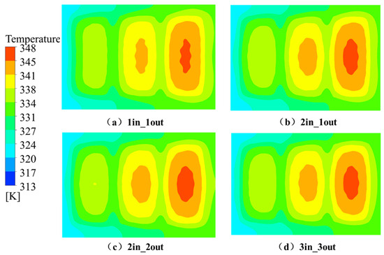 Figure 17 illustrates the steady-state temperature distribution on the top surface of the cooling plate for different inlet/outlet arrangements. It can be observed that while the area of high-temperature zones slightly increases with more inlets and outlets, the overall temperature field becomes more uniform. This indicates that a multi-inlet/multi-outlet layout helps alleviate local hot spots and improves thermal consistency.