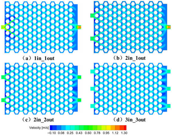 Figure 18 shows the corresponding velocity distributions inside the cooling plate. Compared with the 1in_1out structure, the 2in_1out configuration achieves better overall flow uniformity, albeit with a slightly lower peak velocity. The 2in_2out and 3in_3out cases show similar flow patterns, both offering well-distributed velocity fields. This behavior is consistent with the observed thermal distributions, confirming that improved flow uniformity contributes directly to enhanced thermal uniformity.