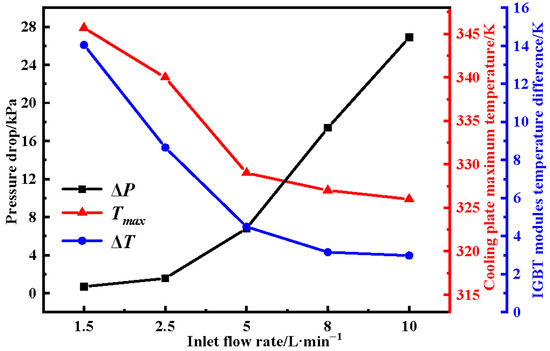 Variation in pressure drop, maximum temperature, and temperature difference under different coolant flow rates.