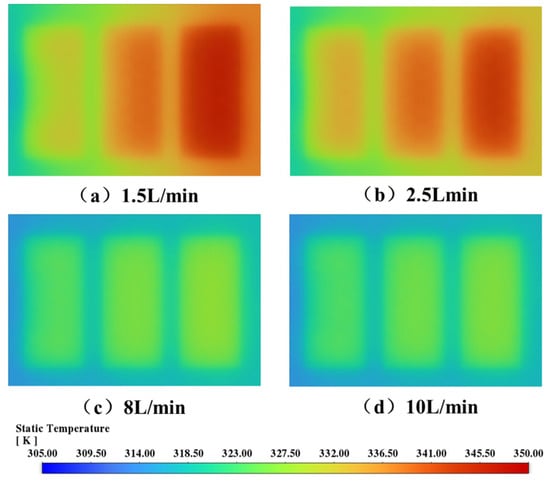 Figure 20 presents the temperature distributions on the top surface of the cooling plate under various coolant flow rates. At a low flow rate of 1.5 L/min, significant hot spots are observed, particularly in the central and right regions of the cooling plate, indicating poor heat dispersion. When the flow rate is increased to 2.5 L/min, the high-temperature zones are partially alleviated, although thermal accumulation remains evident. At higher flow rates of 8 L/min and 10 L/min, the temperature field becomes more uniform and hot spots are virtually eliminated, demonstrating the effectiveness of increased flow rates in improving cooling performance. In general, increasing the coolant flow rate helps enhance thermal uniformity and reduce peak temperatures, but must be optimized against the cost of higher pressure drop and energy consumption.