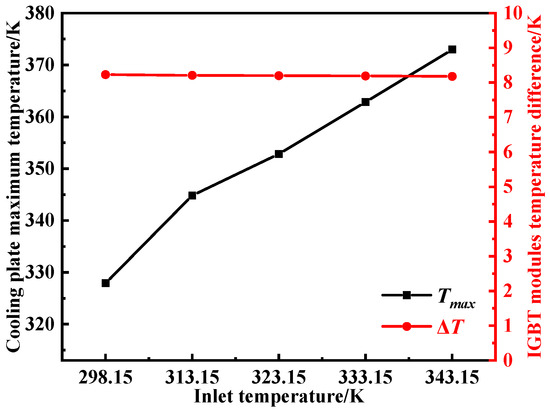 Variation in maximum temperature and temperature difference in IGBT modules under different coolant inlet temperatures.